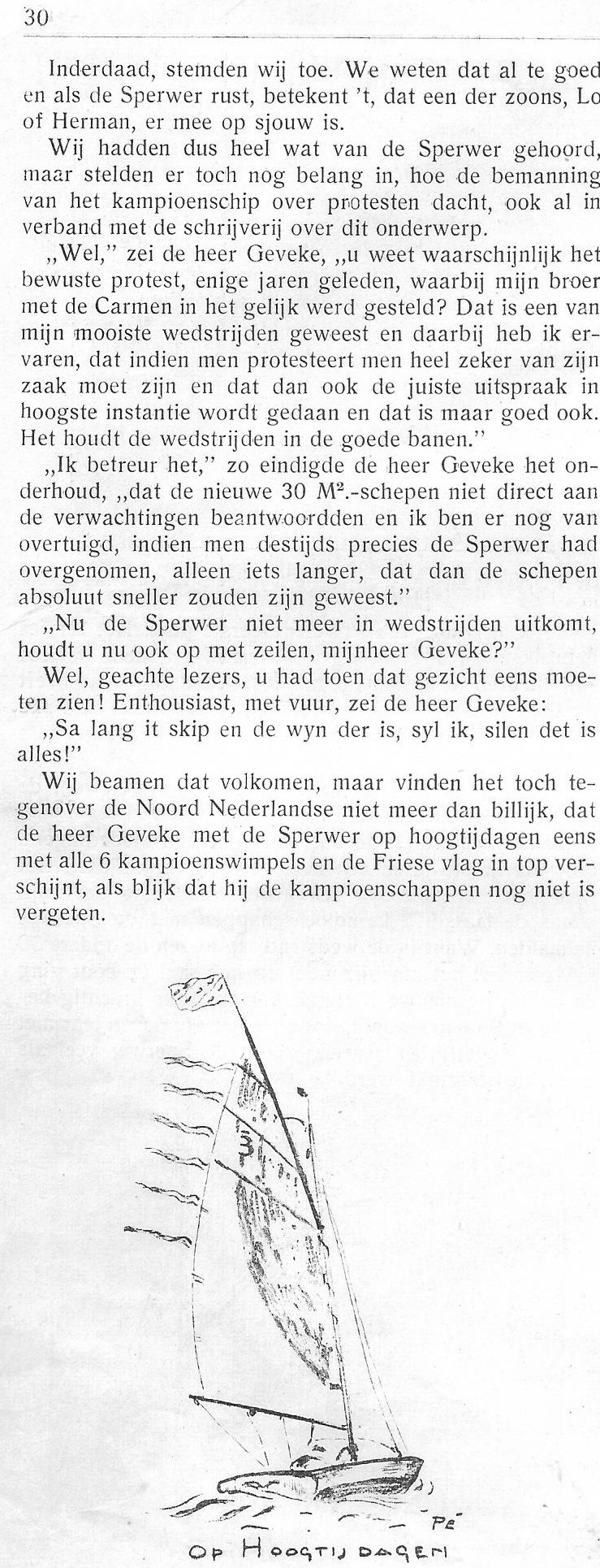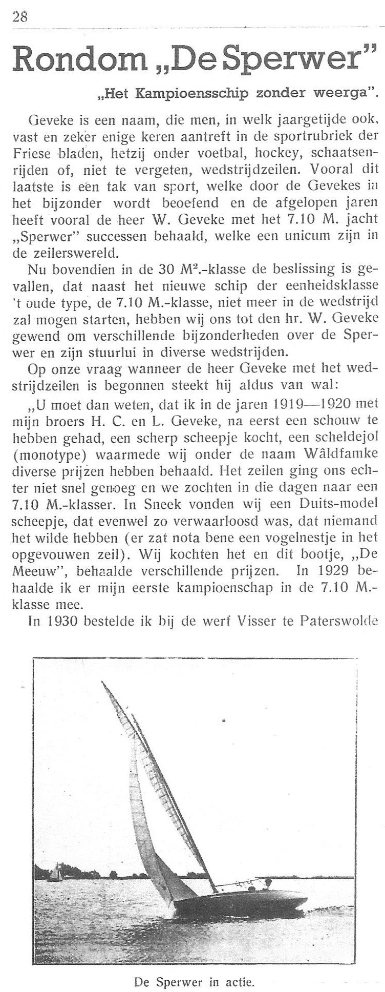 In 1930 liet hij een nieuwe 7.10 de Sperwer bouwen waar hij vele prijzen mee zou winnen en wat mede de aanleiding was in 1936 de 30m2 als eenheidsklasse in het leven te roepen. Aan dit alles is het te danken dat mijn vader en zijn broers ook besmet raakten met het 30m2-virus. Mijn vader was een begenadigd zeiler. In 1947 werd hij geselecteerd in Engeland voor de Olympische spelen van 1948 in Engeland. Tevens heeft hij de Valspar wisselprijs 10 x gewonnen.