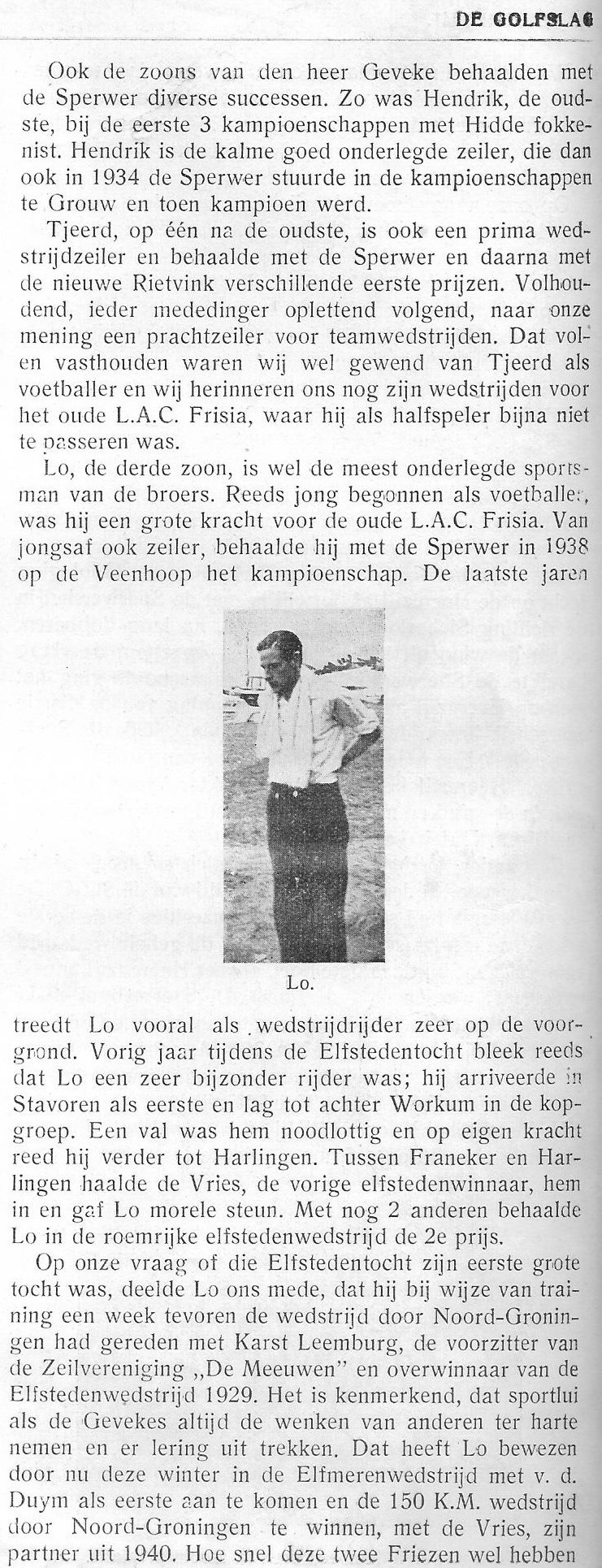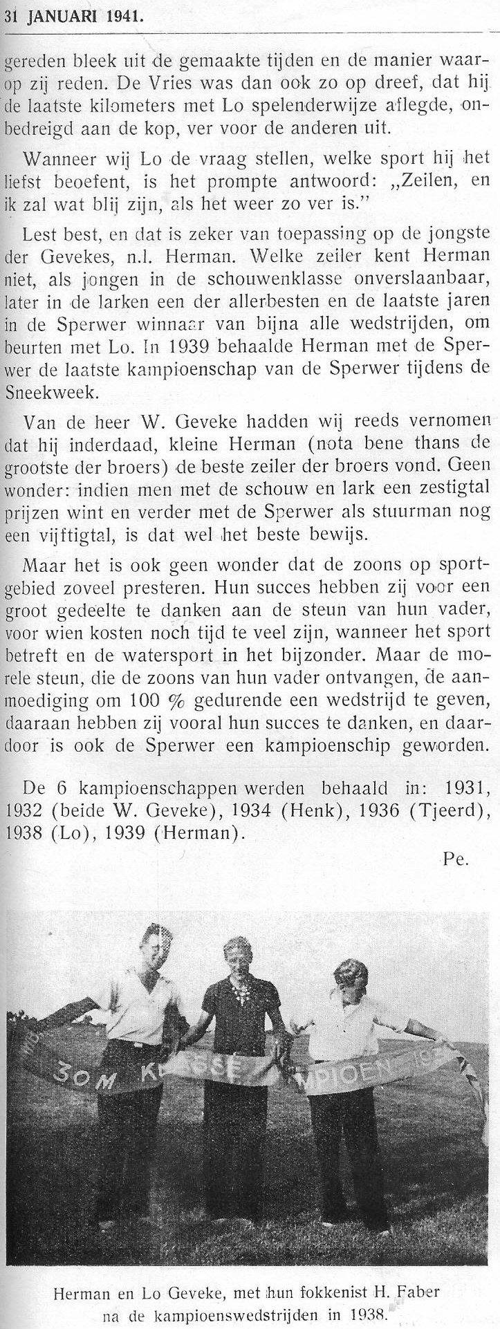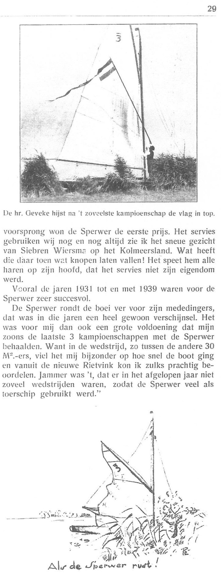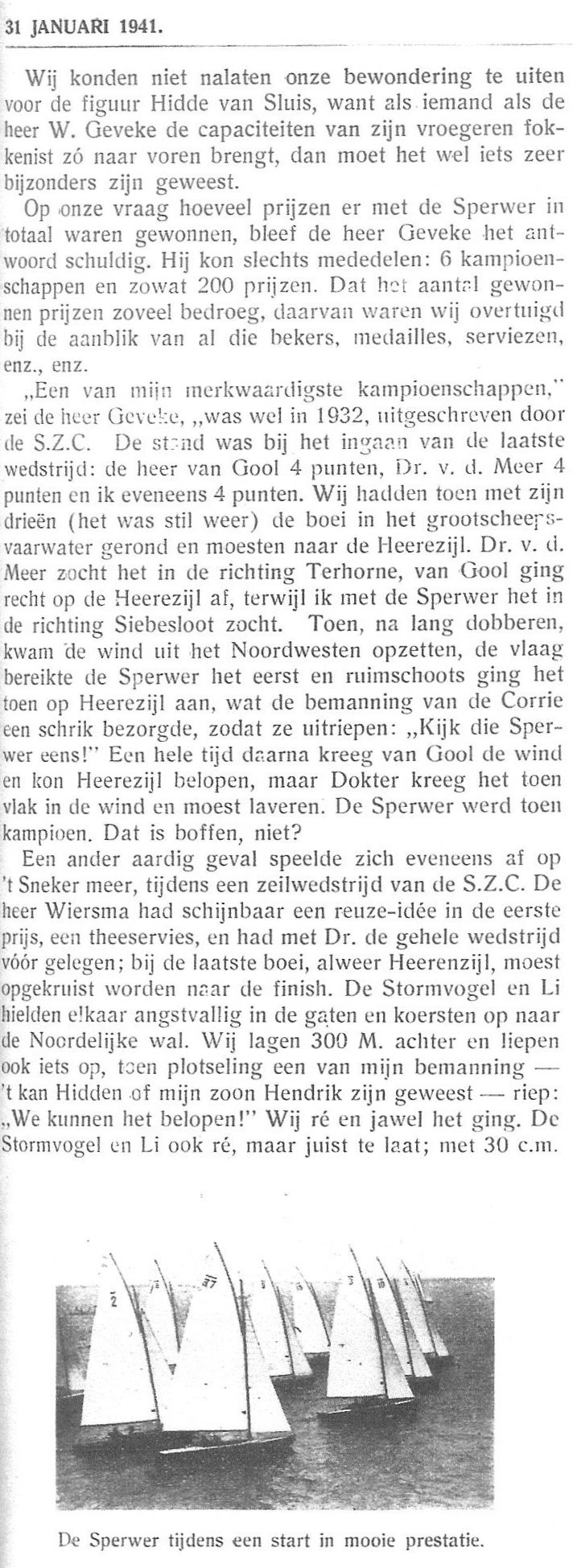 Maar voor mijzelf draag ik dit erelidmaatschap in het bijzonder op aan mijn grootvader William Geveke die 100 jaar geleden voor de huidige club voor die tijd iets belangrijks heeft bijgedragen. Volgens mijn opa in een verslag ,,Rond om de Sperwer” kocht hij in 1919 samen met zijn broers Herman en Lodewijk eerst een Scheldejol en later een 7.10 genaamd de Meeuw.