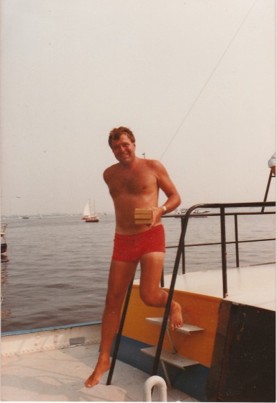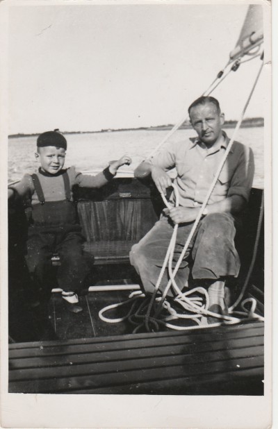 In 1945 kreeg mijn vader van Jurjen Visser de nummer 16 waar hij vele prijzen mee zou winnen. Als kind raakte ik (zie bijgaande foto samen met Oom Tjeerd) op 4-jarige leeftijd, hier ook mee besmet. Op 15-jarige leeftijd (1963) kocht ik van Gerrie Brink voor 3.200,- gulden met geld van mijn vader de 30m2 nummer 5, toen nog genaamd ,,Emmy” en herdoopte deze met de naam ,,Sperwer”. Als dank van mijn vader mocht ik hierdoor als bemanning samen met broer Johan mee de wedstrijden in en mocht daar ook mee toervaren. In 1972 was het trouwjaar van mijn broer Johan en mij en dit was de aanleiding voor mijn vader, om wegens gebrek aan bemanning, de 5 te verkopen. Na mijn vaders overlijden in 1977 ben ik gaan bemannen aan boord van de nummer 4, eerst bij Fokke de Boer waar wij in 1977-78-79 NNWB kampioen mochten worden. Hierna ben ik bij broer Reindert de Boer, mijn latere bestuurslid gaan bemannen. Hij wist hierna nog 2 maal de hoofdprijs in de Sneekweek te winnen.